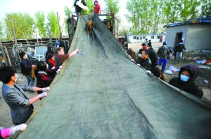 为了让狗狗们快速“下车”,志愿者们用帆布搭建起了一条滑道。