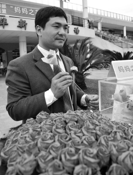 2009年5月10日,刘猛义卖“妈妈之花”(资料图片 来源:华西都市报)