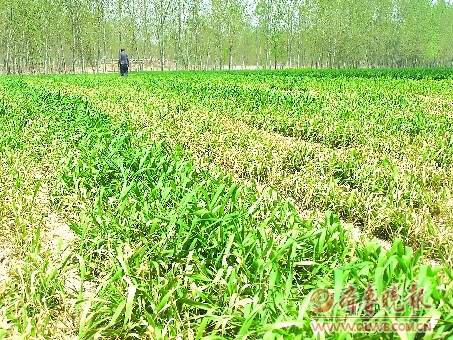 在莘县董杜庄镇,浇过污水的小麦渐渐变黄死掉。 本报记者 刘彦朋 摄