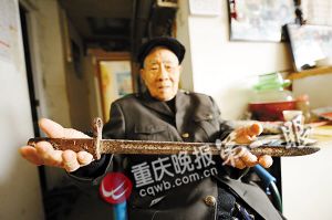 尹泰邦老人捧着的这把刺刀是妻子丁素莲从日本鬼子手中夺过来的
