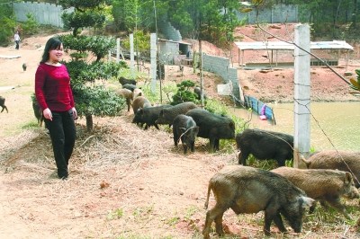 记者昨日在涂娅莉的养殖基地看到,这些野猪喝山泉水,吃山林中的草和有机饲料,住的是基地专做的生态房。目前,涂娅莉的养殖基地总投资已达600余万元,20多亩山地院子成了“野猪乐园”。现在,来自广州、深圳的餐饮业名家纷纷前来采购,养殖基地的600多头野猪可获利100万元。(记者 蔡早勤 通讯员 熊明木 实习生 尹倩)