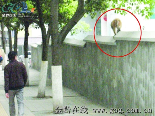 记者在现场见到,一只土黄色的猕猴正在医学院附近的加油站内游荡,一会儿朝跳上灯杆跑去,一会儿又跳上树梢。