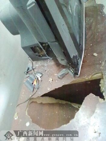 爆炸发生后,电视机和电视机柜都出现了大洞。