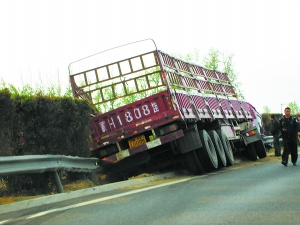 事发地点位于京承高速出京方向10公里处黄港路段。肇事车辆是一辆“蒙”字牌照的大货车。大货车拉了满满一车钢筋盘条,因为一头“骑上”了隔离带,车头和车身几乎被“解体”,左侧车厢厢壁被钢筋盘条撞开,十余捆钢筋盘条散落在反方向的路面上,占据了两条车道。