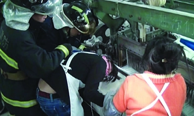 记者赶到现场时发现,在纺织厂的车间内,这名女工弯着腰,长发和左手被卷进了纺织机器内,疼痛难忍。工厂技术人员告诉救援人员,这里有两个活动的杆,她的手可能就夹在这里面了。救援人员询问,是手先进去的,还是头发先被卷进去的。技术人员回答,谁知道呢,估计是头发先被卷进去的。救援人员决定马上拿个剪刀,先把头发剪断。