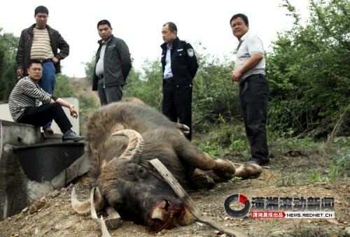 (21枪击毙的疯牛,重达400公斤左右。图/潇湘晨报滚动新闻记者 王兴夏)