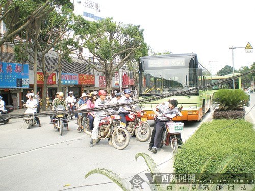 昨日(25日)下午,一辆满载小食品的大货车行至南宁市五一东路29号附近时,由于将横穿马路上空的电缆线刮落,同时导致5根水泥电线杆断裂歪倒,车辆通行受阻。事故发生后,交警、城管等部门立即找来竹梯,将坠落的电缆线支撑起来,使过往车辆能缓慢通行。