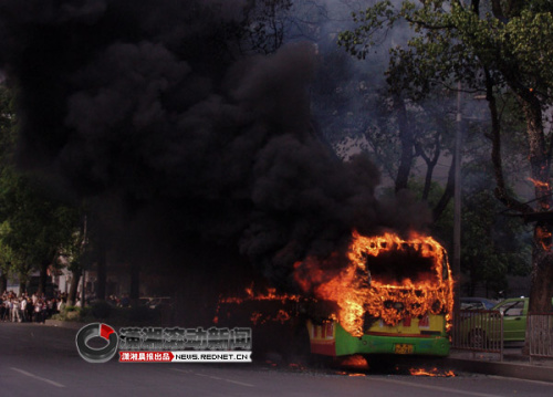 昨天下午,韶山路东塘北公交车站,一辆124路公交车发生自燃。现场火光冲天,浓烟滚滚。图/骆坚