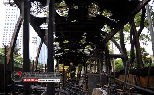 (17时30分,大火被扑灭,整个公交车已被烧成空空的铁架子。图/潇湘晨报滚动新闻记者 赵尚渝)