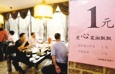 一家餐馆在醒目的位置,张贴着“1元爱心菜”的海报。王涛 兰雪艳 摄