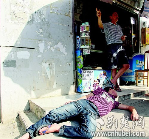 下午4时,记者赶到这家副食店门旁,只见一名年轻小伙半身在台阶上,半身在台阶下,侧躺着昏睡不醒。