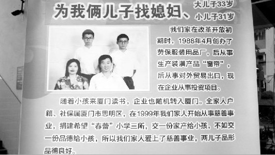 他直接在厦大海韵公寓的食堂门口竖起了征婚广告牌,还把儿子的个人资料放在一边,像传单一样供人取阅。可见,秦老伯的心情是何等焦虑!