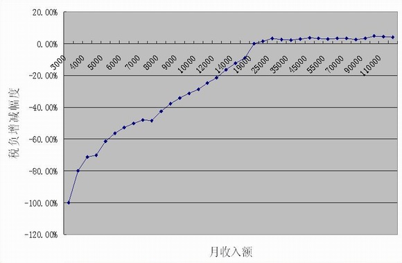 再考虑到草案将减除费用标准(即社会上所称“起征点”)从2000元提高到3000元,不考虑可在税前扣除的三险一金的情况下,各收入群体因个税调整而发生的税负变化如下表: