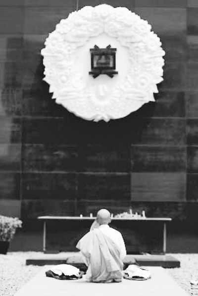 上好香,老人从肩上卸下包放在两侧,然后捡起一块小石子压住被风吹起的“谢罪”布角,掏出“太鼓”,脱下球鞋,面对“奠”字长跪磕头。几分钟后,打坐,手敲“太鼓”口念佛经,为南京大屠杀30万遇难的中国人祈祷。很多人听说老人是一人自费到此谢罪,被触动了,“其实挺不容易的……”