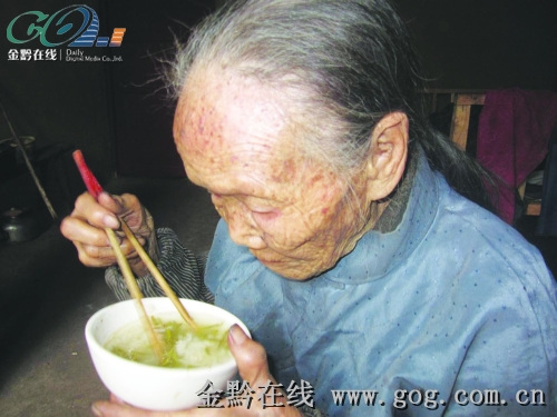 103岁的李友珍老人正在吃茶水泡的饭。