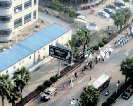 这张图片显示,到一个路口,送葬人员就拉开白布条拦路。