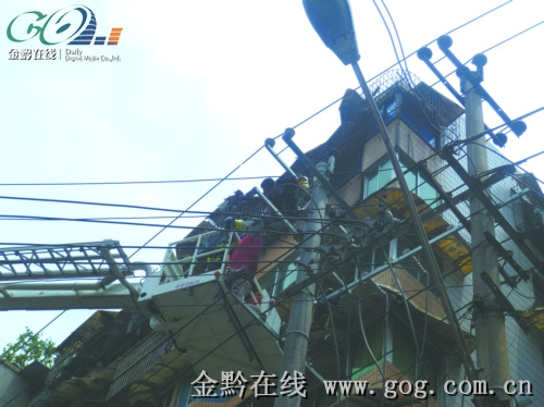 昨日(4日)早晨,贵阳市小十字蔡家街巷道一根电线杆上,一名正在维修电路的电工遭电击,被困电杆,消防队员经过一小时的紧张救援,成功将伤者救下。目前,伤者身体多部位灼伤,正在医院接受治疗。