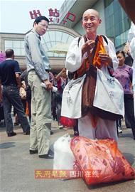 成都火车北站出站口,身着僧袍,背着“谢罪”字样挎包的岩田隆造一出现便引来疑惑的目光,人们好奇地打量着这位装束奇特、步履蹒跚的老人。只会几句简单中文的岩田隆造,双手合十,不时微笑着朝身边的人说一句“你好”。
