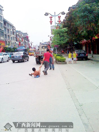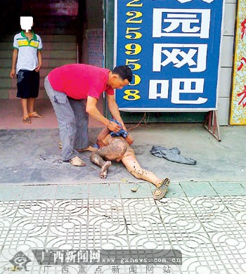 近日,在河池某网站论坛上一组题为“虐待儿童”的照片引起强烈关注:一名男子当街将一个男孩扒得一丝不挂,男孩倒在地上,满身泥污,男子则拽着他的腿暴打他。5月5日,记者几经周折找到了照片中的男子和男孩,发现他们是一对父子。10岁的小萌(化名)偷钱去上网,父亲覃某发现后,一时气愤,做出了过激举动。他对记者述说着与网络争夺儿子的艰难和苦恼,数次落泪。