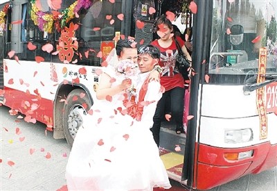 这辆打扮成闺房出嫁的公交车,是为218路车长刘静准备的。美丽端庄的新娘刘静在闺蜜的陪伴下,静静地在车后面坐着,正幸福地等待新郎呢。