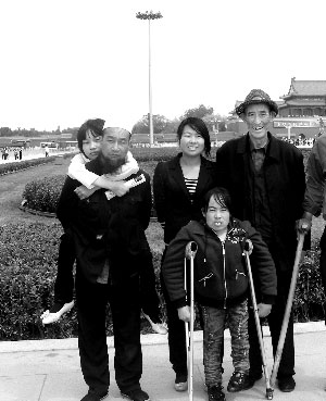 本月,马成明(右一)与残疾患儿及亲属在天安门前合影。