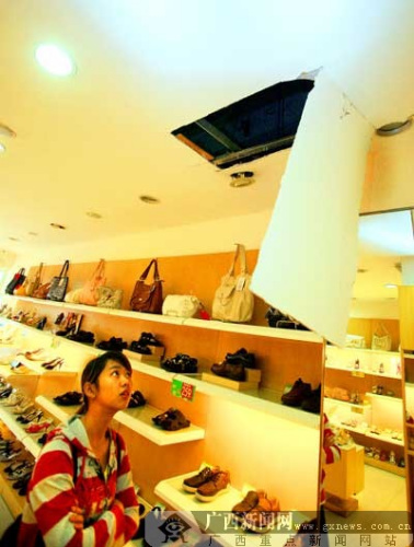 昨日上午9时,店员陈小姐来到鞋包专卖店,卷闸门像往常一样好好锁着;开门进去,店内的摆设似乎也没有任何异常。可是刚往前走了几步,陈就看到了天花板上兀然出现的两个大窟窿。