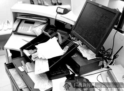收银台被砸坏的抽屉,一些毛票和单据凌乱不堪地放在桌上。记者唐寅 摄