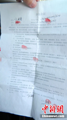 小包工头与承建方签署的“分包合同”。吕子豪 摄