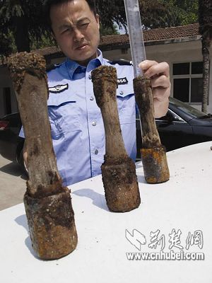 当民警到胡家了解情况时,60多岁的胡婆婆一脸茫然。在征得她的同意后,安陆市公安局治安大队与当地武装部的军械专家一起赶往现场,经过半个多小时的挖掘,在胡婆婆平时睡觉的床下挖出了3枚手榴弹和7发军用子弹(如图)。“真没想到,我在手榴弹上睡了几十年,”胡婆婆吃惊地说。