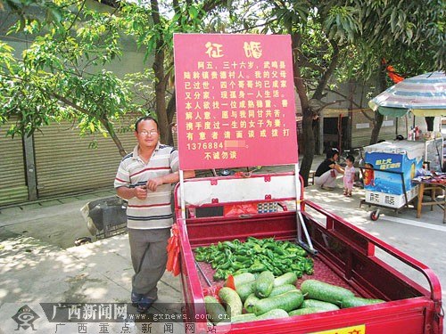 近日,武鸣县灵水社区的菜市里经常能看到一名特别的卖菜男子,他在运输蔬菜的三轮车上竖起一块“征婚启事”,上面写着自己的家庭情况和联系方式,边卖菜边征婚。附近居民都觉得很新奇,称他为“征婚哥”。