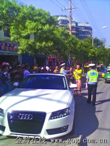 据了解,昨日下午3点半左右,在贵阳兴关路转盘处,贵阳交警二大队二中队民警拦下一辆从军区方向开来的白色奥迪轿车,该车未悬挂机动车号牌。交警对车主进行询问,该车车主拿出一张临时号牌,但号牌已经过期。当交警让该车车主出示驾驶证等有关证件时,没想到该车车主看见路口绿灯亮了,马上发动车子往前驶去。