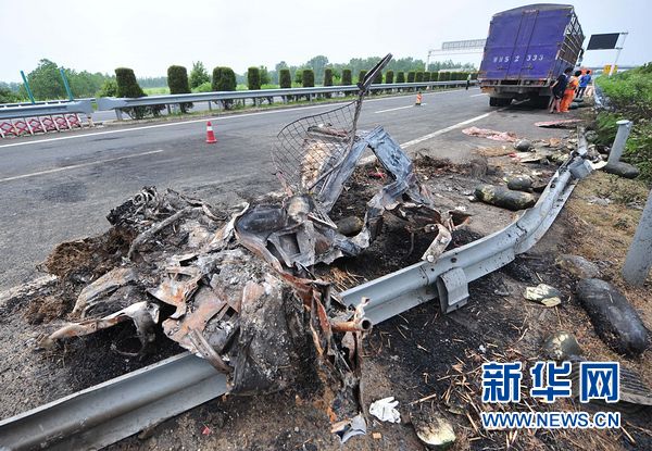 7月4日拍摄的事故车辆残骸。当日3时50分许,随(州)岳(阳)高速湖北省仙桃市毛嘴段一辆大客车被追尾致翻倒燃烧,目前死亡人数上升为26人,受伤31人,其中重伤3人,伤者已送到事发地附近的医院治疗。新华社记者 程敏 摄