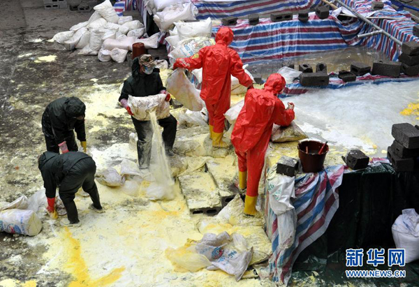 1月27日,在广西柳州市柳城县糯米滩水力发电厂,武警消防战士将袋装碱投入水池,准备引人江中稀释污染水体。位于珠江上游的广西龙江河段近日发生镉超标污染事件,当地及下游沿岸城市饮水安全遭受严重威胁。广西各级党委、政府迅速行动,一方面采取加大下泄流量、投放中和物、调水稀释等方式努力降低镉浓度;一方面及时发布相关信息,保障物资供应,缓解市民恐慌情绪,打响了一场针对重金属镉污染的“阻击战”。新华社记者 陆波岸 摄