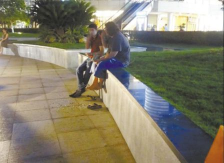 5月29日晚上9点半左右,网友“白白的太阳”在和义大道星巴克前的喷前边,看见两名外籍男子坐在草坪边上嗑瓜子,脚下吐了一地的瓜子壳。