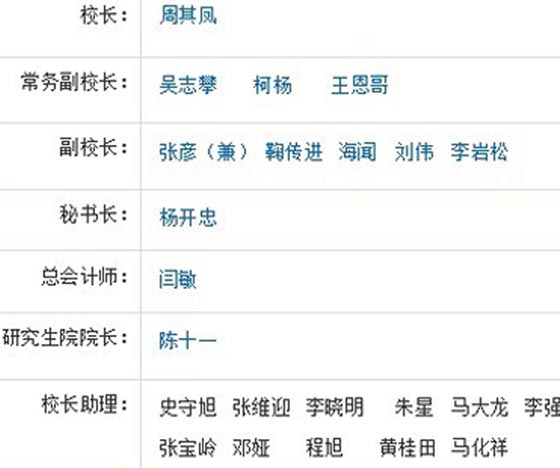 此外,记者发现,清华大学的校领导机构没有设置校长助理,但是各级别校领导总数也达到了23人。中国人民大学的校长有6位助理,但是校领导机构的人数则比北大和清华要少,仅为16人。