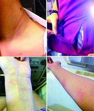 空姐“花Money买毛豆”微博上贴出照片显示,其身上有伤痕、衣服被扯破。