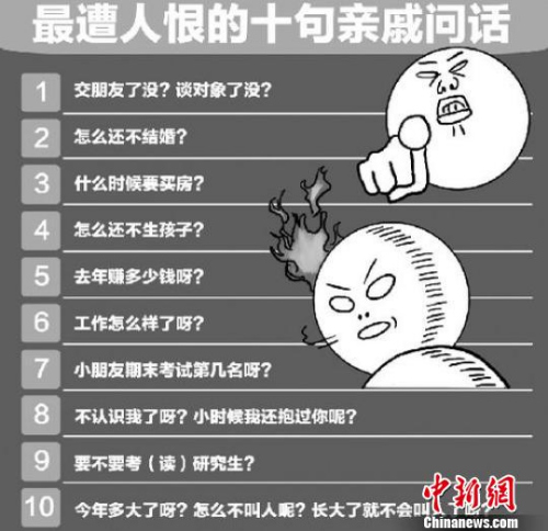 中新网1月29日电(生活频道 袁野)“去年春节表哥帮介绍一个,觉得不合适就吹了”,1991年出生的河南籍刘女士对中新网生活频道吐槽,自打工作以来,每年春节家人亲戚都会“轮番上阵”,询问其终身大事。如今春节又将来临,面临催婚压力的单身一族不禁感叹“年关难过”。