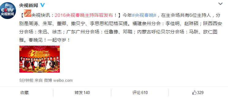 【央视快讯:2016央视春晚主持阵容发布!】今年央视春晚,在主会场共有6位主持人,分别是周涛、朱军、董卿、撒贝宁、李思思和尼格买提。福建泉州分会场:李佳明、赵琳硕;陕西西安分会场:朱迅、徐杰;广东广州分会场:任鲁豫、邓璐;内蒙古呼伦贝尔分会场:马跃、欧仁图雅。春晚见!一起守岁!