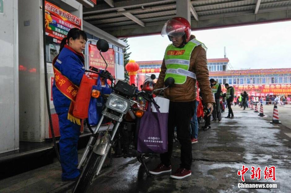 2月1日,距离春节还有一周,在广西贵港市火车北站,300名“摩托大军”搭乘动车从广东的广州、肇庆等地出发返回家乡。返乡大军的129辆摩托车,已于1月30日通过货运专列运抵贵港,工作人员从火车货运站将摩托车转运至贵港市大圩镇一加油站。在此为摩托大军的“铁骑”免费加满油后,贵港市交警部门分三路以警车带路,护送返乡人员骑着摩托车完成最后一段路。黄威铭 摄