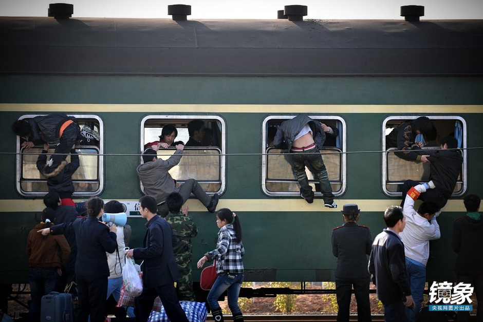 2016年春运已经拉开大幕。作为人类史上规模最大的、周期性的大迁徙,春运在短短的十数日内的旅客发送量高达数十亿人次。在此期间,许许多多的人们经历千辛万苦,穿过大半个中国回家过年。而每当此时,随着归乡的游子们纷纷汇入春运大潮,一幕幕的人在“囧”途也随之上演。图为2009年1月12日,惠州火车站,来不及上车的旅客,拉的拉,扶的扶,从车窗爬进车厢。图片来源:央视网