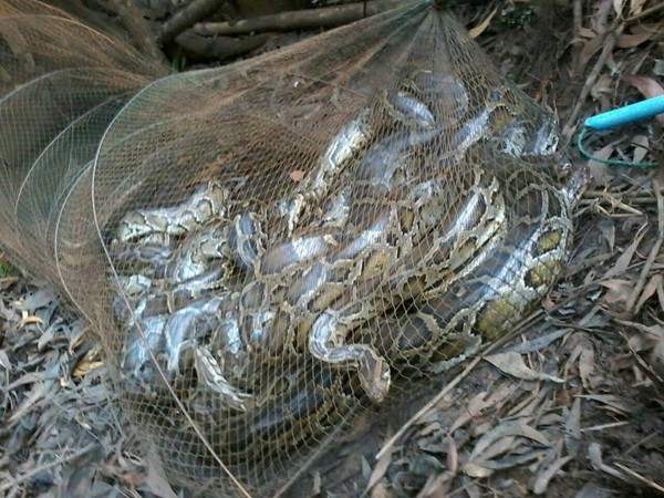 动保团体拉起网后发现至少有5、6条蛇,8人合力才把蟒蛇一条条抓起来带到丛林深处野放,其中一条蛇长度大约要5个人捧着。后来当地人猜测那应该是一个蛇家族,溜到陷阱里吃鱼,因为不久后又有人在附近发现一条蟒蛇,在当初设置陷阱的不远处还有一窝蛇蛋。