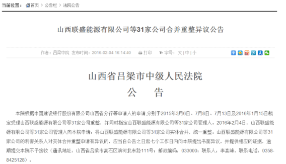 2月4日,山西省吕梁市中级人民法院官网发布《山西联盛能源有限公司等31家公司合并重整异议公告》。公告称,本院根据中国建设银行股份有限公司山西省分行等申请人的申请,分别于2015年3月6日、7月8日、7月13日及2016年1月15日裁定受理山西联盛能源有限公司等31家公司重整,并同时指定山西联盛能源有限公司等31家公司管理人。2016年2月4日,山西联盛能源有限公司等31家公司管理人向本院申请:将山西联盛能源有限公司等31家公司实体合并,统一重整。