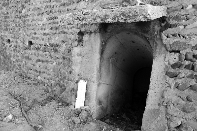北侧洞口直接嵌在挡土墙中,洞口瘦高、拱顶,足够一人出入,门洞上方设一挡板,地道四壁为混凝土砌筑,看上去非常结实。进洞后下台阶两米后左转,里面一团漆黑,用手电照射发现通道已被垃圾封阻。