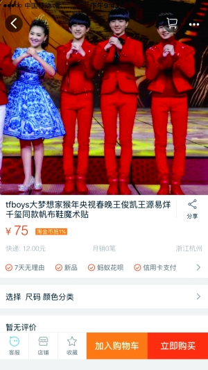除此之外,TFboys所穿的一身红色套装以及谭维维所穿的豹纹套装都是搜索热门。通过网站搜索记者发现,大部分网店都在售卖TFboys的同款红色套装,更是贴上了“显腿长”的标签,价格更是从最低39元到最高899元不等。“看着明星穿效果那么好,心里痒痒也想试试。图个开心。”一名买家告诉记者。