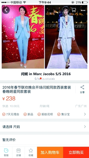 除夕夜的猴年春晚上,闫妮在舞台上演出开场大歌舞。节目中,她身穿水蓝色的西服套装。节目结束不久,同款西装出现在网上,店主还在旁边标注“接受大量预订”,价格也是从几十元至上千元不等。一家网店店主告诉北京晨报记者,工厂已经连夜赶工制作同款服装,现在接受预订,年后可以发货。记者看到,该店的预订量已经有40余件。