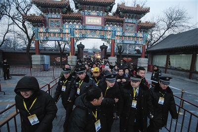 昨日,雍和宫大街,早7时,安保人员手挽手在前排引导香客们从大门走向售票处。当天是大年初一,大批游客与信众前往雍和宫烧香祈福。本版摄影/新京报记者 彭子洋