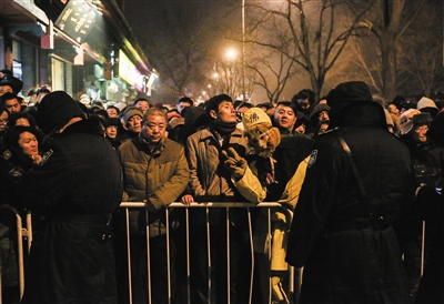 昨日凌晨5时,雍和宫门前已排起百米长队,宽5米左右的通道挤满了香客,被围得水泄不通。不少排队者穿着羽绒服棉鞋、头戴棉帽,依然被凌晨的寒气侵蚀,在原地来回跺脚,反复看着时间。