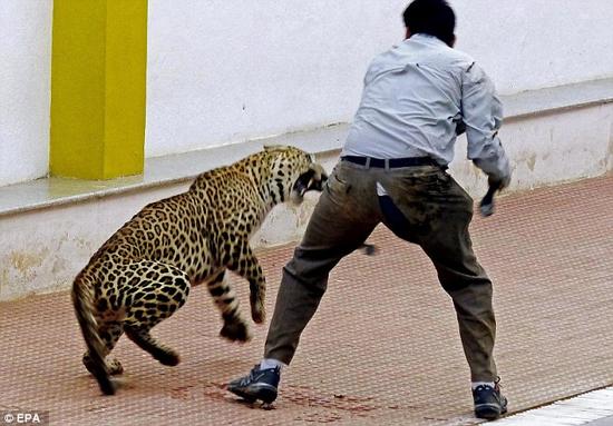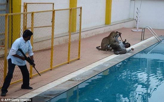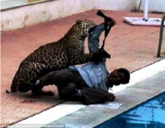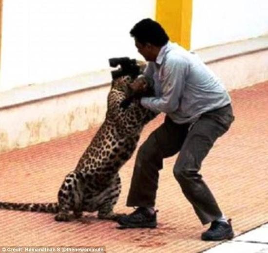 2016年2月8日报道,印度班加罗尔,一头野生豹子突然奔入学校伤人,共有6人受不同程度伤害。其中一名动物学家遭到突然攻击,该男子拿起望远镜搏斗这一瞬间被拍摄下来。