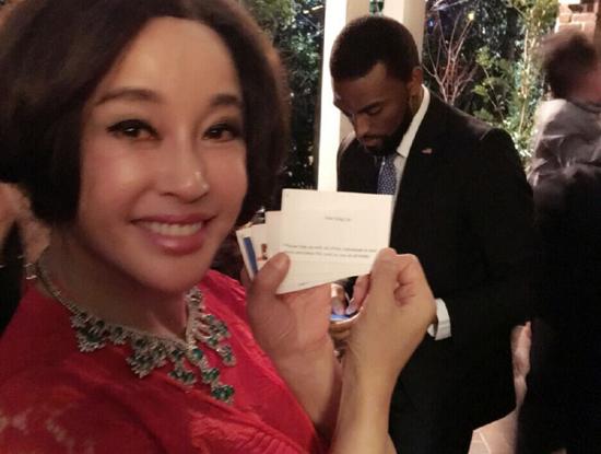 12日,刘晓庆微博晒照,称:“刚刚见了美国总统奥巴马,做为奥巴马的NO.1 VIP贵宾。”刘晓庆穿红裙大气端庄,奥巴马在花园里发表了近40分钟的演讲。