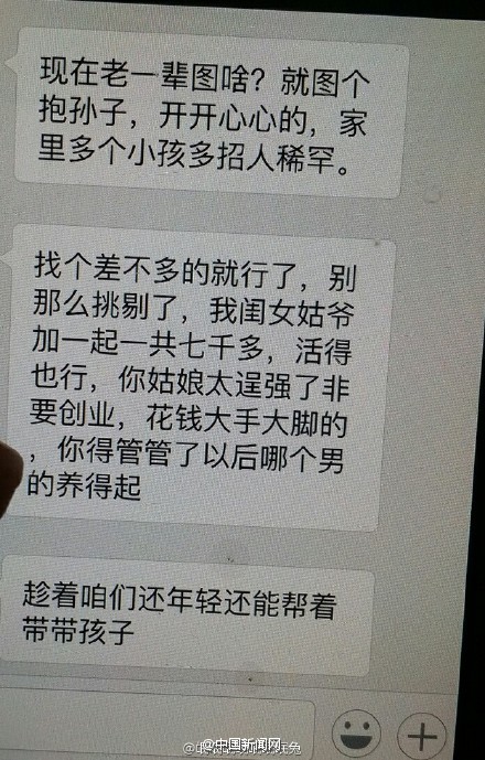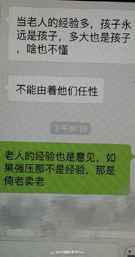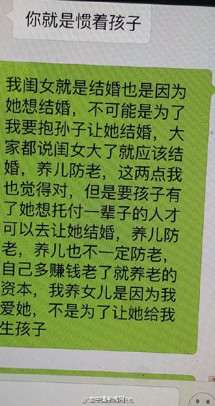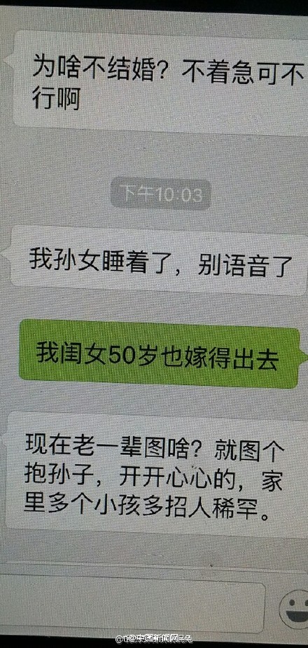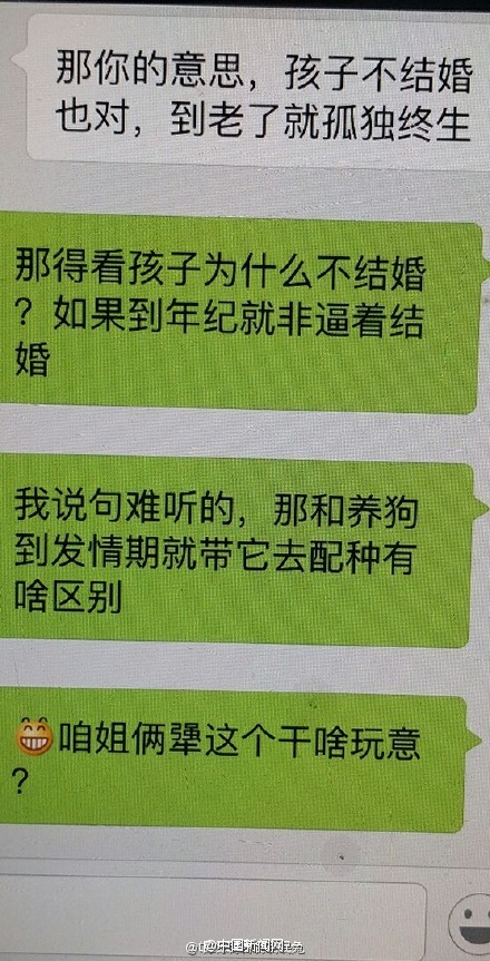 [我养女儿是因为我爱她!]近日,网友@氓氓氓氓氓氓氓兔 po出了自己母上大人的一组微信记录,小编戳进去一看,简直泪奔啊对方上来就是“不结婚让别人笑话”、“不生个孩子老了就得等死”之类的理论狂轰滥炸,而老妈的回答确是…你还在被逼婚吗?